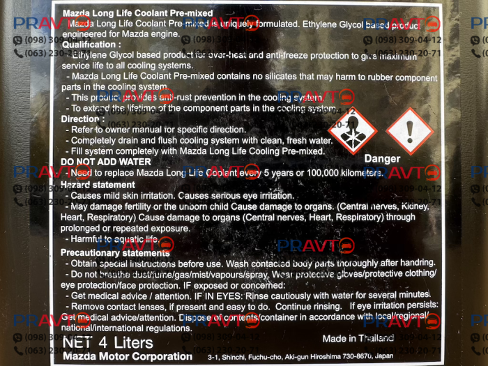 Антифриз FL-22 повністю відповідає специфікації OEM Mazda FL22 Coolant і не містить силікатів, які з часом руйнують гумові ущільнення та прокладки. Завдяки оригінальній формулі, рідина подовжує термін служби водяної помпи, радіатора та інших елементів системи охолодження. Підходить для всіх сучасних моделей Mazda.