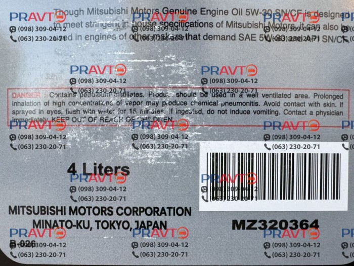 Mitsubishi Motors Genuine Engine Oil 5W-30 SN/CF MZ320364 — фирменное моторное масло, разработанное инженерами Mitsubishi специально для бензиновых и дизельных двигателей бренда. Формула создана на основе длительных исследований и многоэтапных испытаний на стендах по всему миру, что позволило добиться стабильных характеристик и превосходства над обычными коммерческими маслами.