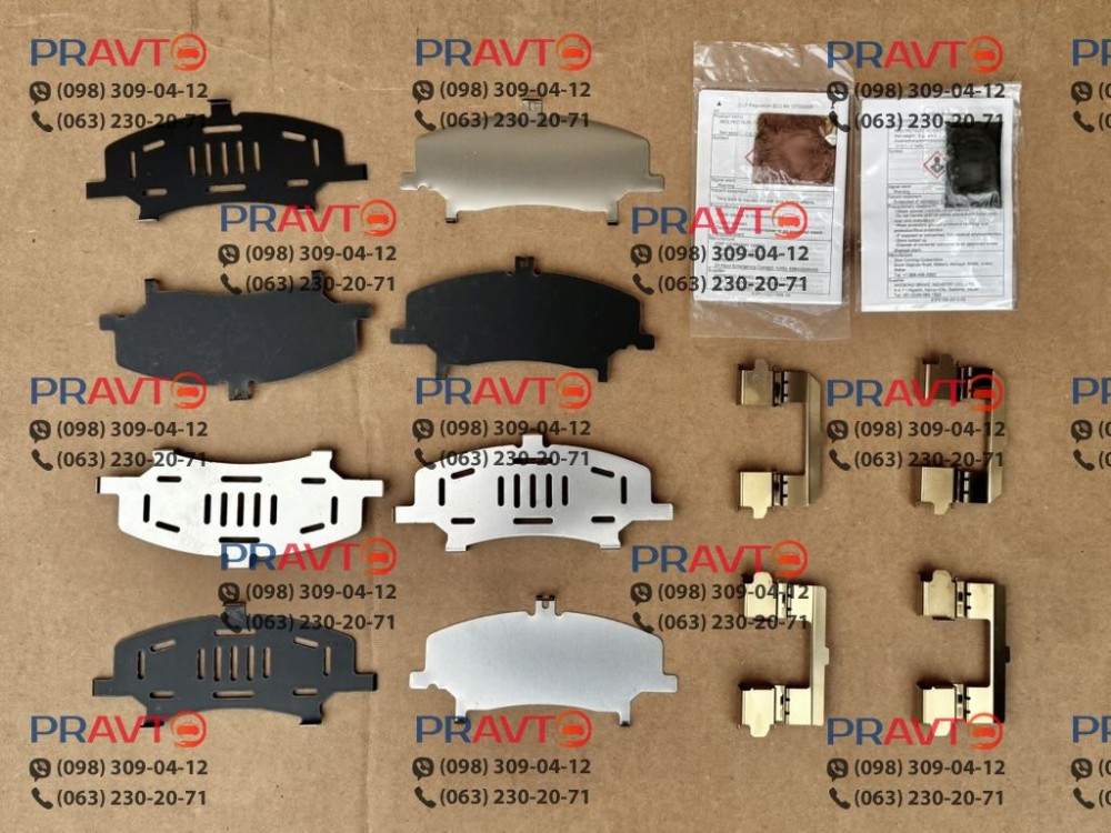 Комплект включает: 8 пластин (по 2 на каждую из 4 передних колодок), 4 направляющие скобы для установки в тормозной суппорт, а также 2 вида фирменной смазки Molykote: